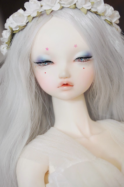 Ta-daaaah! She is done :) Well, not quite. My friend is sending me some stencils to paint her eyebrows on, the little sequins I've glued there for now are only placeholders for her white star eyebrows I'll hopefully be doing later on this week! Her eyes are also photoshopped since I don't have her Oscar Eyes yet - they'll be here sometime in June, and I'm really looking forward to seeing her 100% complete. This is actually the second faceup I've done on her! Her previous one had a different lip style and white eyeliner instead of black. I've just made some very small improvements including some gold accents on the lips and refined white lace designs around her eyes.